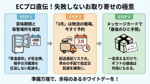 今すぐ予約注文をして、配送指定日をホワイトデー数日前に設定しておく。