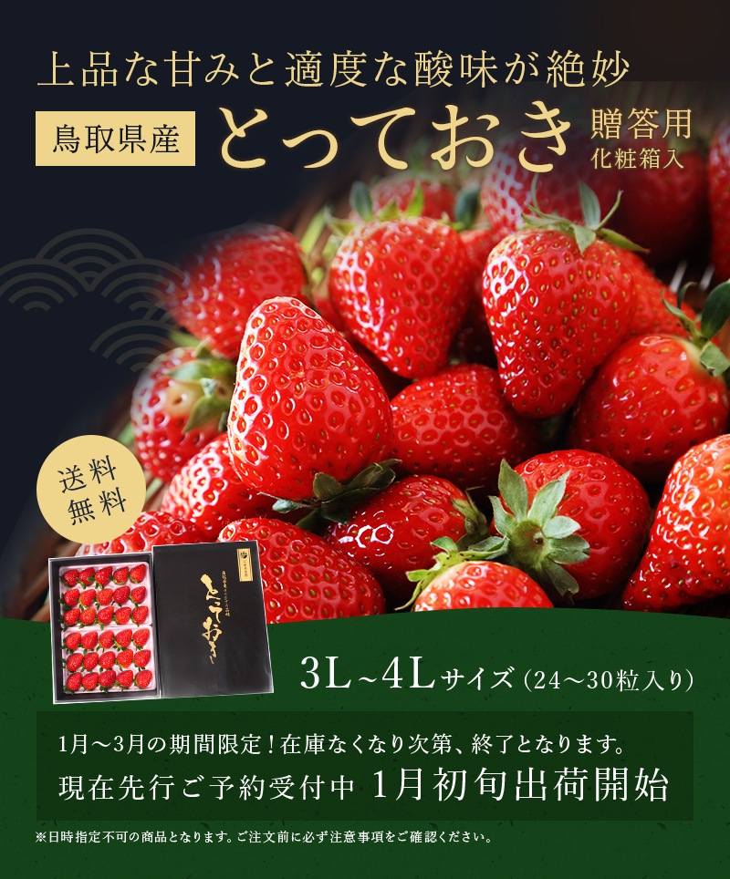 【送料無料】【3月末までの出荷】 鳥取県オリジナルいちご「とっておき」 贈答用 3L~4L 24粒~30粒