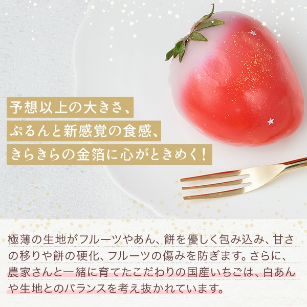- 国産いちご、白あん、砂糖、加工澱粉、着色料(赤3、赤106、金箔、銀箔) ※小麦、卵、乳は使用しておりません。