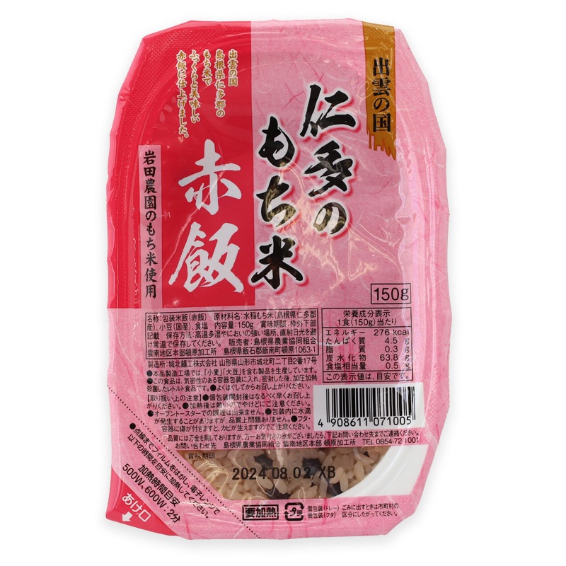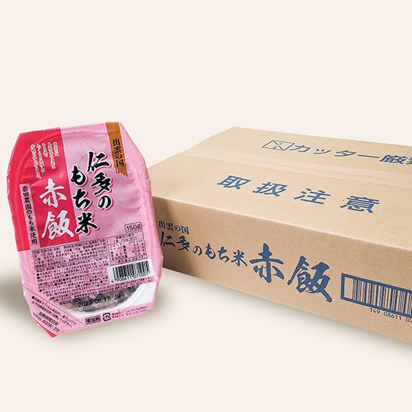 仁多の美味しいもち米を使用した赤飯パックです。もち米のモチっとした食感と国産小豆の風味をお楽しみいただけます。 パックご飯で調理簡単。着色料や保存料を使用していないので安心してお召し上がりいただけます。