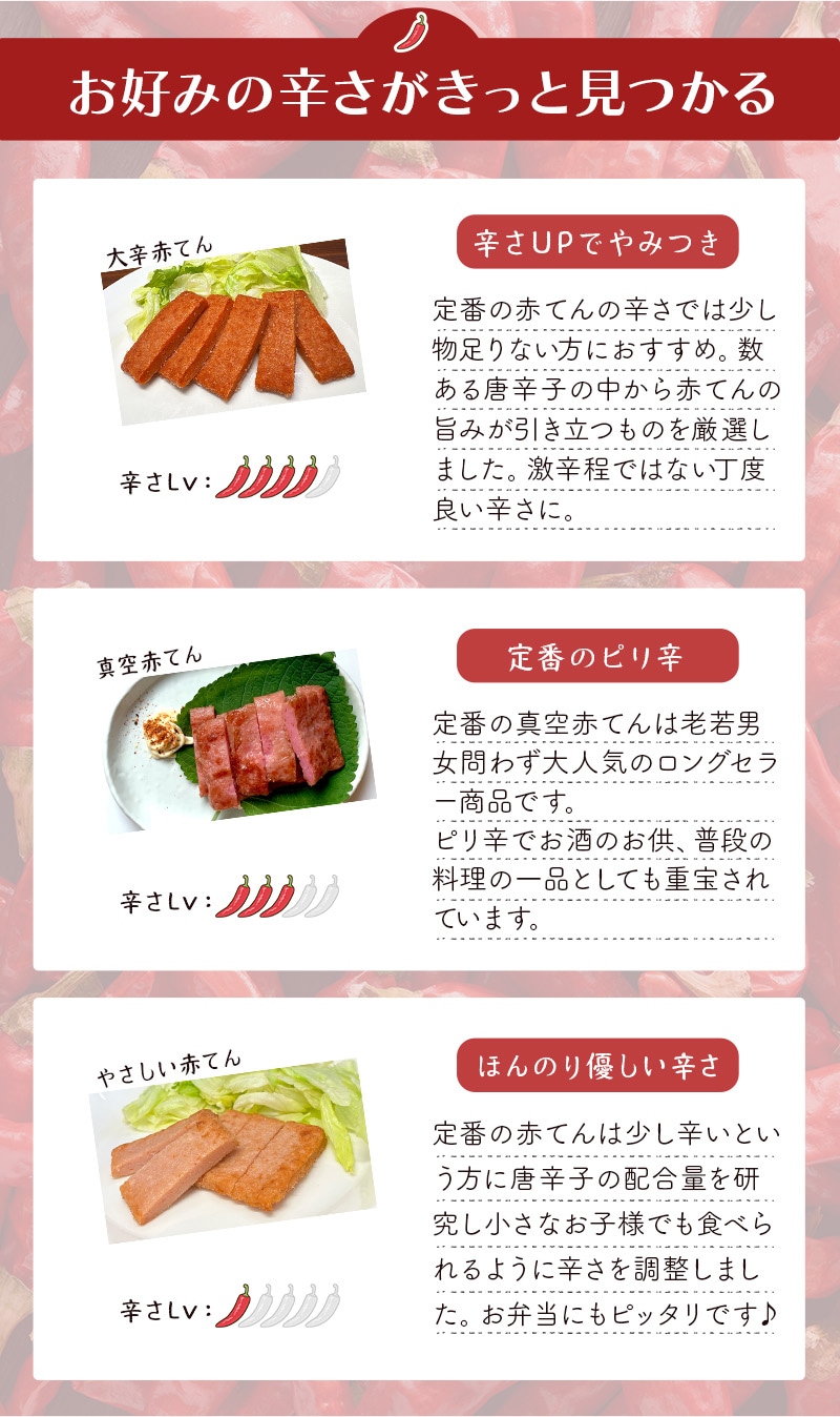 - 真空赤天5枚(1袋当たり)、真空やさしい赤天3枚(1袋当たり)、真空大辛赤天3枚(1袋当たり)
